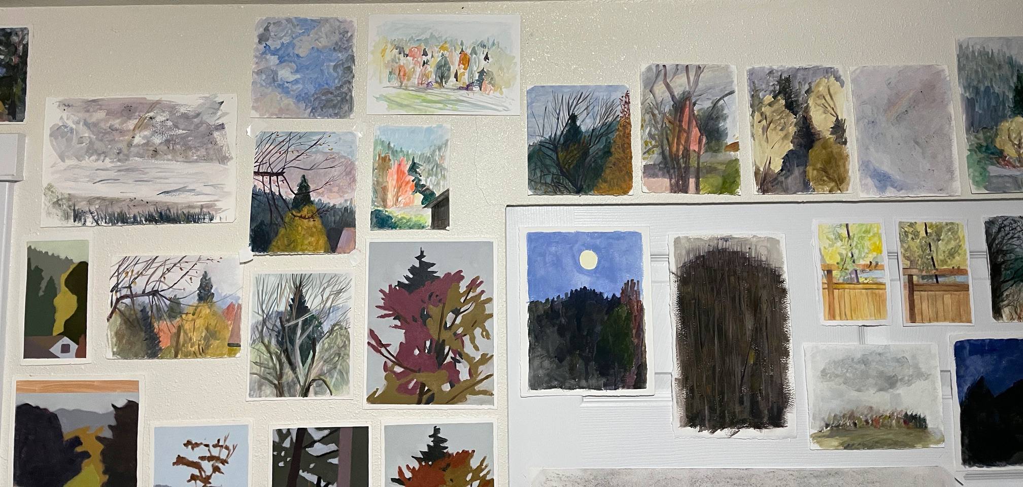 Recently in Growth Studio each member created a challenge for themselves. The challenge was about self-trust and how to strengthen our authentic connection to our work as artists. I embarked on making quick paintings in acrylic or gouache relying on my memory or a loose sketch of something I had seen in the landscape that filled me with awe or sparked my curiosity. To make it a daily challenge I could stick to, I worked for only about 20 minutes on each painting on average. Part of the challenge was reserving judgement and allowing playfulness and experimentation into the work. These little paintings are leading me forward in the studio right now. I don’t have them all documented yet, but here are a few: